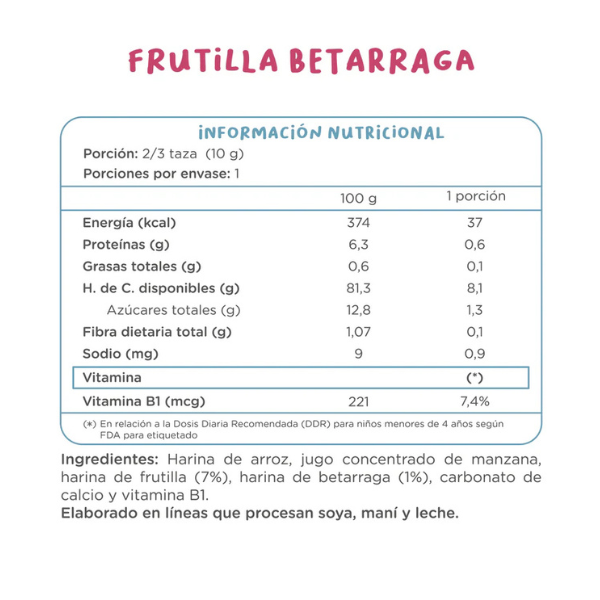 Cereal infantil a base de harina de arroz, jugo concentrado de manzana y harina de frutilla y betarraga. Apto para consumo a partir de los 8 meses de edad.